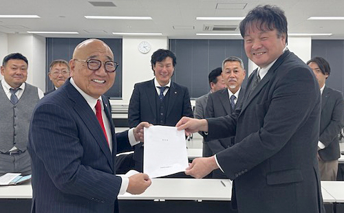 近畿地方整備局では、京都府本部の上田会長(班長)、森山浩司副会長(副班長)が担当し、石田聡調査官へ要望書が手渡されました。
