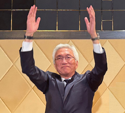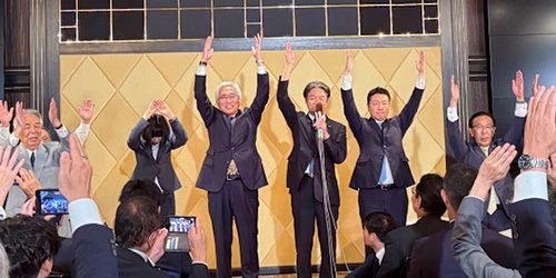 駆け付けた支持者らと万歳三唱をおこなう西田氏
