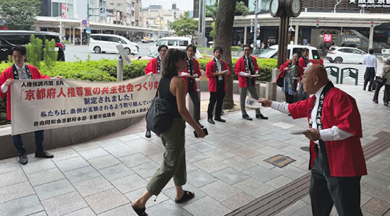 | 自由同和会京都府本部(上田藤兵衞会長)・京都市協議会(山口勝広議長)、協賛のNPO法人自由人権国民会議(上田藤兵衞理事長)では、 毎年「人権強調月間」(8月)に併せて、街頭啓発活動と「えせ同和」行為の排除を積極的に働きかけるため、国の関係機関らで構成している 「えせ同和行為対策関係機関連絡会」のメンバーである京都地方法務局・京都府警察本部に対し、要望をおこなっています。 |